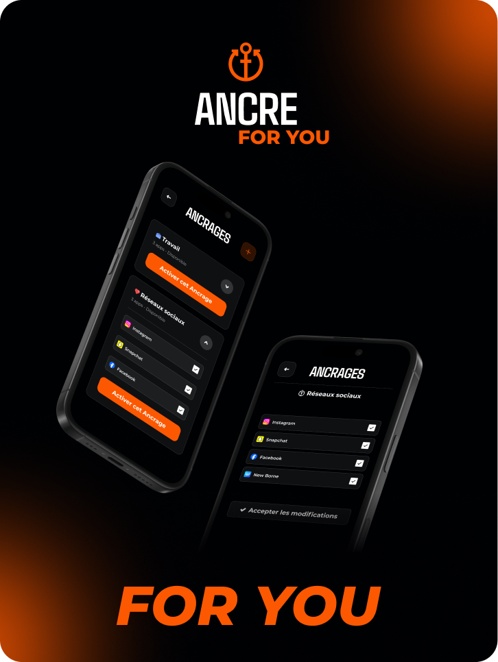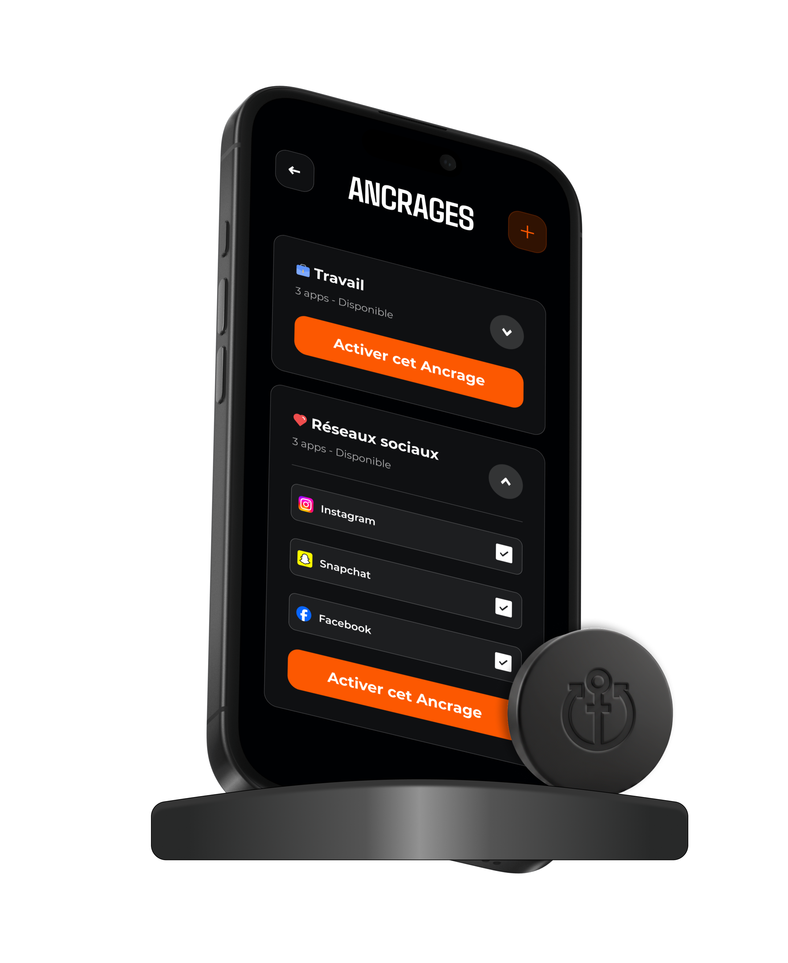 Lorsque vous avez votre ANCRE, mettez là à une place adéquate pour vous. Ensuite, il vous suffit d’ouvrir l’application et de choisir vos applications que vous souhaitez bloquer. Enfin, pour activer le bloquage, il vous suffit d’approcher votre téléphone de l’ANCRE. Pour le débloquer, vous devrez à nouveau l’approcher du module.